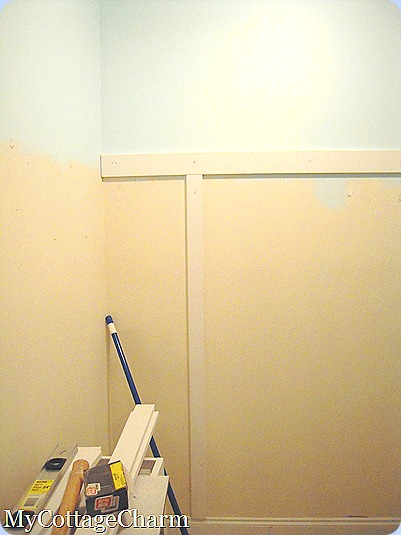 I asked if anyone had a guess as to what I was doing with that piece of wood on the wall, and Patti from Crystal Rose Cottage and Deborah from Fairfield House, guessed a wainscoting of some type …and they were right! I’m doing board and batten in here!