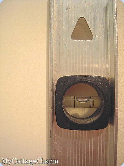 I started out with the top piece. I made sure it was nice and level with my handy dandy level! I actually put it up and took it down because it looked crooked. Come to find out my ceiling has a slight uphill slant so it was level after all……..I re-installed it. LOL